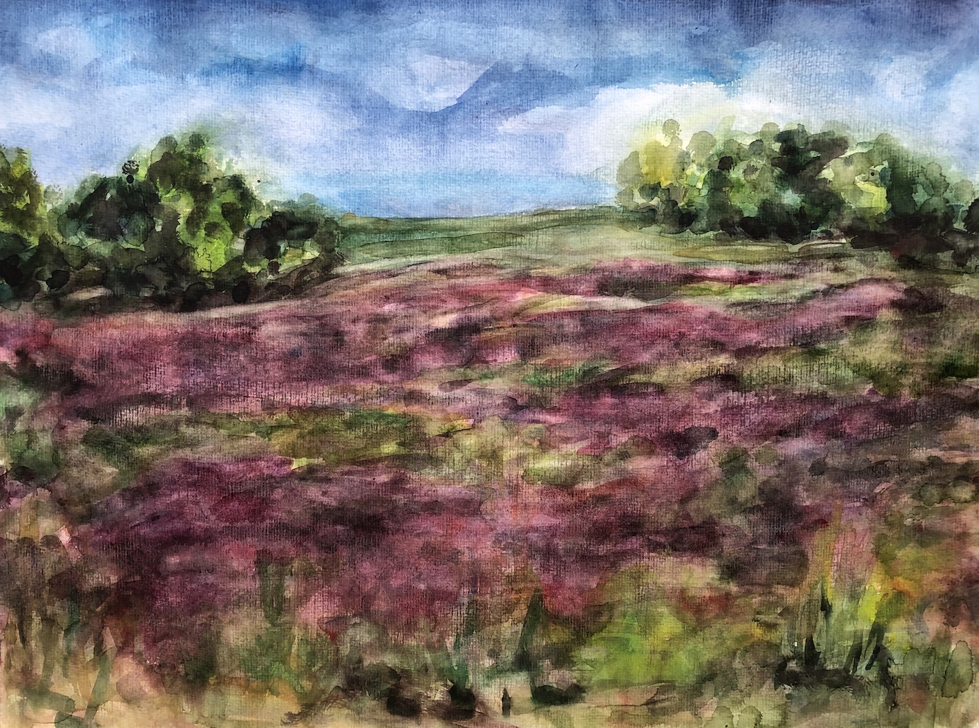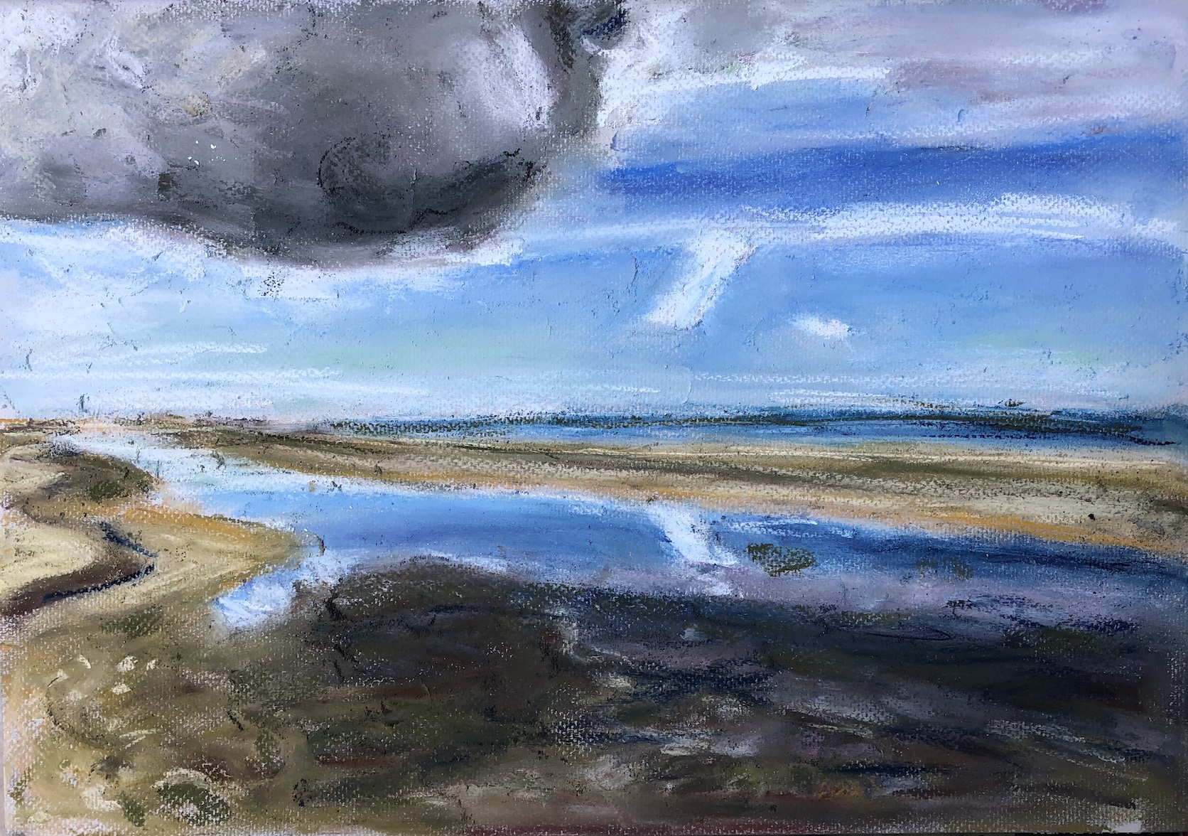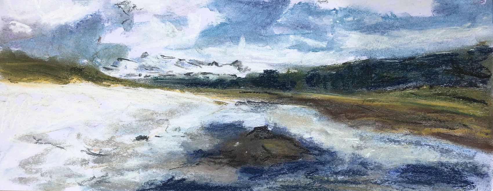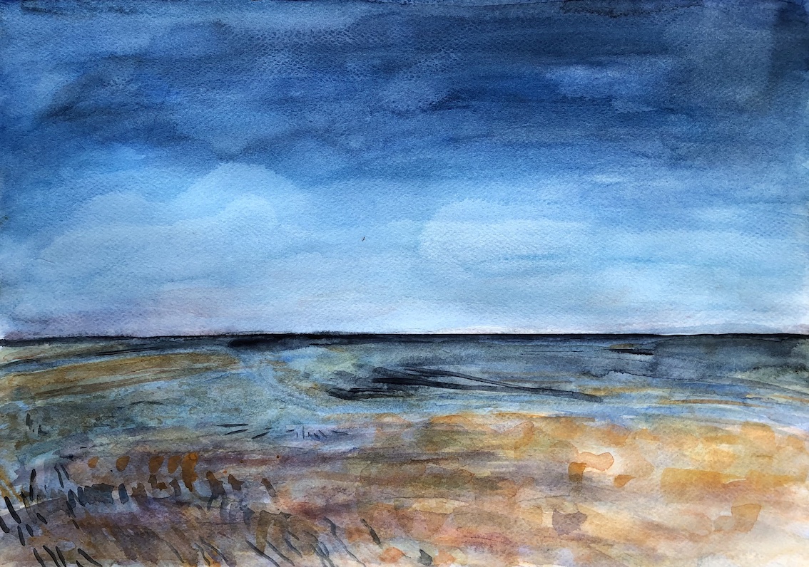 Licht und Dunkel, Wasser, Himmel, Wolken, Berge und grün, das wächst, so saftig… Oder karge Erde, Steine, Sand: Den Zauber einer Landschaft würde ich gern einfangen können, aber das gelingt auf Fotos soviel schneller und besser. Trotzdem,  schon das Nachvollziehen, das langsame Malen, die Beschäftigung damit tut gut. Und vielleicht gelingt durch viel Übung irgendwann eine kreative Aneignung und Umwandlung.